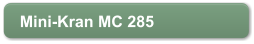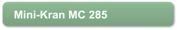 Mini-Kran MC 285Tragkraftkg2.820 bei 1,40 mMax. Arbeitsbereichm8,20Max. Hebehöhem8,70Hubgeschwindigkeitm/min8Schwenkwinkel°360 endlosKranabmessungenm2,71 x 0,75 x 1,44Abstützungen4 (hydraulisch)Seiltyp IWRC 6 x Fi (29) f 7 mm x 48 mEigengewichtkg1720Antrieb Yanmar 9 PS/ DieselTankfassungl12Standardausrüstung: Fernbedienung, Lastüberwachung, Arbeitsscheinwerfer, 2-Rollen-Kranhaken, Betriebsstundenzähler